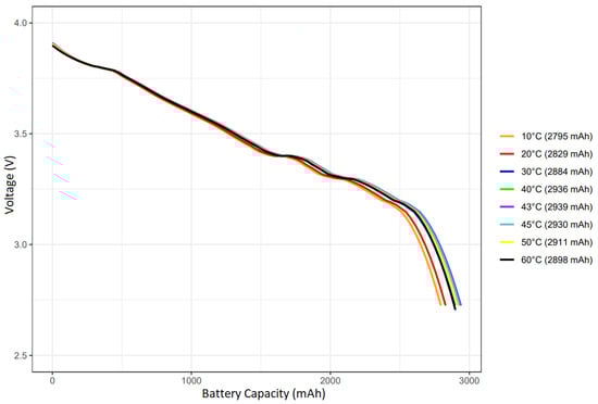 Discharging at 1C at eight different temperature values was carried out with the DL24P discharge device, and the results are given in Figure 4. Different batteries were used at each temperature, and the tests were started after the batteries were discharged at 1C and charged at 1C as they left the factory.