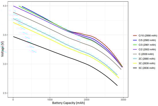 In this test setup, discharges were performed at C/10, C/5, C/3, C/2, C, 2 C, 3 C, and 5 C ratios. The Aspilsan 18650 NMC battery used in this study has a capacity of 2900 mAh. This capacity value of the battery means that it can meet 2.9 A for 1 h. While charging and discharging processes have a positive effect on the battery’s capacity at low C rates, at high C rates, some of the energy is converted into heat and causes capacity loss on the battery. The evolution of the capacity as a function of the discharge rate is given in Figure 6.