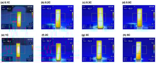 The battery capacity decreased by around 5% of its capacity when the C ratios increased from C/10 to 5 C, while the heating increased from 43.2 to 93.6 °C (Figure 7). The breaking point of the heat increases is observed above 0.5 C. At high C ratios, some of the energy during the charge/discharge process is converted into heat energy, decreasing the battery capacity.