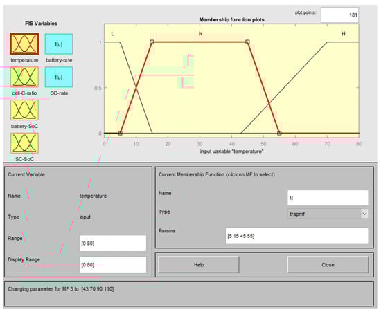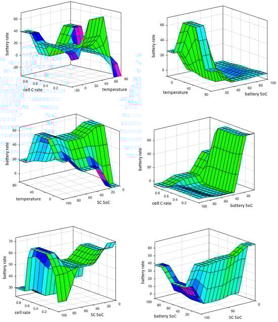 A fuzzy logic control system has four inputs, namely temperature, charging current, battery SoC, and SC SoC, and two outputs, namely the battery transfer ratio and SC transfer ratio. The boundary ranges of these inputs were determined by the experimental studies, and a dataset of 1000 units was created. Table 4 shows the data entered into the “Matlab® Fuzzy Logic” system. The main objective is to prolong the battery life by maintaining battery health by directing energy from regenerative braking to the SC under high temperatures, high charging currents, and high battery SoC conditions.