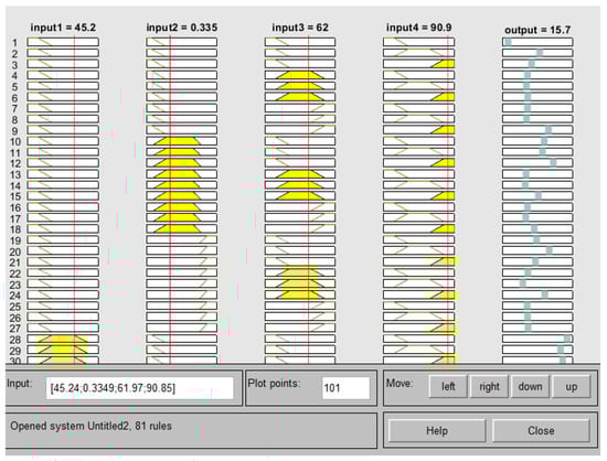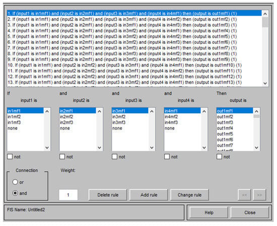 After the membership functions for all the input values were created according to the specified boundary values, 800 data points were entered for the training phase in the ANFIS environment. Based on these data, ANFIS generated 81 rules. These rules are shown in Figure 9, and the interval variables associated with them are shown in Figure 10.
