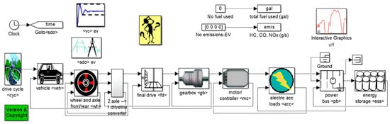 The ADVISOR program was developed by the National Renewable Energy Laboratory (NREL) in the late 1990s [56]. The ADVISOR program is used in the analysis of conventional, hybrid, and EVs. Since it is an open-source software, many researchers have contributed to the program’s library. In addition, because it works as a Matlab Simulink module, it offers the flexibility to create a control strategy. ADVISOR makes agreements with commercial automobile manufacturers and universities to ensure that the algorithms reach minimum uncertainty. There are 59 different driving configurations in the program. Each configuration parallels real-life situations and is recognized by international institutions [57].