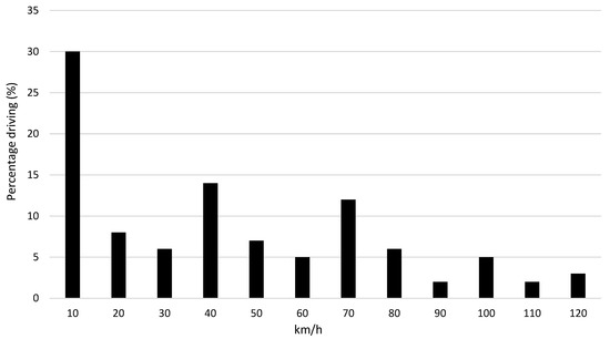 The NEDC driving cycle is carried out at an ambient temperature ranging from 20 °C to 30 °C and a driving cycle distance of 10.93 km. The maximum speed during the cycle is 120 km/h, and the average speed is 33.21 km/h. In addition, the total duration of this drive is 1184 s, and the maximum acceleration is 1.06 m/s2. The majority of driving occurs within the city (Figure 14). Because this driving cycle includes both urban and non-urban driving, it is a suitable driving technique for EVs in terms of application. Figure 15 shows the speed ratios of the driving cycle in percentages.
