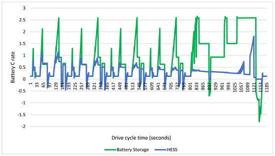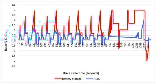 In the simulation environment, the vehicle’s road conditions in Europe (NEDC) were simulated, and the current values drawn from the battery and HESS were analyzed. The negative values represent the charging current from regenerative braking, and the positive values represent the current drawn from the battery during the driving cycle. The current values are calculated as the C value per battery and are given in Figure 16. When the current values drawn from the battery and the current values from regenerative braking are analyzed, the battery in the HESS is exposed to 29.1% lower current values than the battery storage system. This will contribute to the battery’s health and help the battery to be used longer.