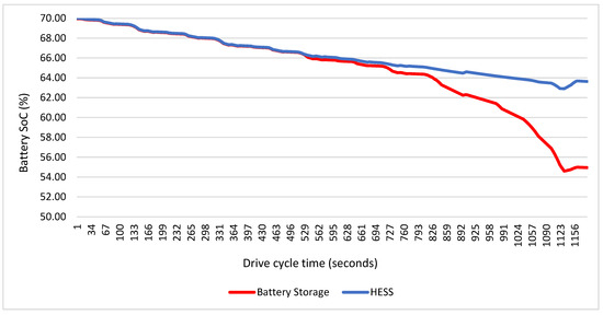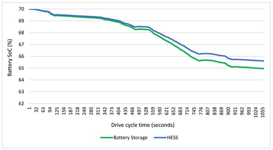 The Simcemter Flomaster program was tested at a 70% battery charge and a 50% SC charge. The hybrid storage system completed the driving cycle with a 4.15% battery loss, whereas the battery storage system completed the driving cycle with a 5.02% battery loss. Figure 21 shows the SoC change in the systems during the driving cycle. Figure 22 shows the battery SoC values obtained after the driving cycle at a 20 °C outdoor temperature and different SoC values of the battery.