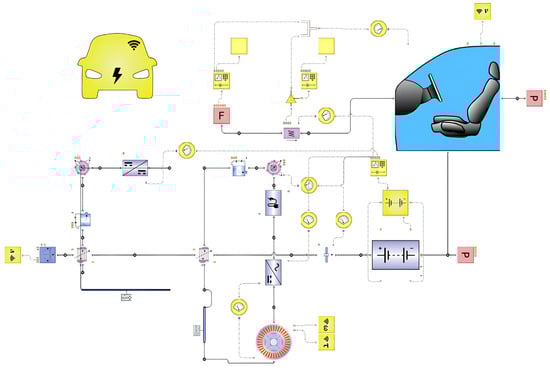 Based on the data entered on the vehicle data entry screen, a blog diagram is automatically created for the EV, while a new blog diagram is created for the HESS. In the automatically generated diagram, data can be obtained from all the important units of the EV, such as the brakes, wheels, engine, and battery. In the HESS, the battery and SC are connected in parallel, and a fuzzy logic controller is added as the control system. Figure 12 shows the blog diagram of the EV, and Figure 13 shows the blog diagram of the EV with the hybrid storage system.