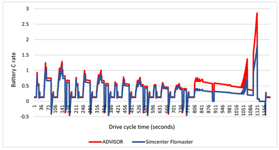 The comparison of the HESS controlled by fuzzy logic with the battery storage system was carried out in the ADVISOR and Simcenter Flomaster programs. The NEDC driving cycle was used in the simulations, and the current values on the battery and battery SoC were compared. Although SCs lack a high energy density, they quickly store the instantaneous energy demands from regenerative braking and quickly meet the instantaneous energy demands during sudden acceleration. In this way, the consumption values on the battery were reduced and the battery’s health was maintained by reducing the high current values in the energy stored and consumed from regenerative braking on the battery. Figure 25 shows the current values generated on the battery by the HESS in ADVISOR and Simcenter Flomaster programs.