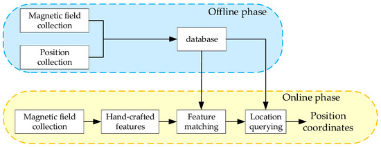 Specifically, this process consists of two phases, the offline and online phases [15], as shown in Figure 2. In the offline phase, a magnetic database with a certain granularity is built in the region of interest through measurement and interpolation. During the online phase, the collected magnetic sequences are manually extracted to features and matched with the fingerprints in the database. One of the above algorithms is used to calculate the most likely location.