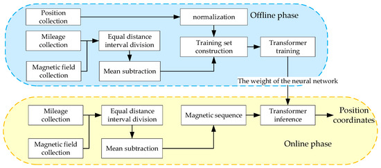 Based on the abovementioned vehicle characteristics, we design the architecture shown in Figure 3, which consists of an offline phase and an online phase. During the offline phase, the three-axis magnetic field vectors within a certain distance are collected and divided into equal distance intervals based on their mileage, which ensures that the sequence is independent of the vehicle’s speed and magnetometer’s sampling rates. Moreover, the true positions are collected as the labels of the training set, which are normalized to 0~1 to easily train the Transformer model. Thus, using multiple collected data, a training set that includes numerous sequences consisting of the magnetic field and the corresponding positions of a fixed number of points is generated. During the online phase, the trained Transformer model predicts the position coordinates with equidistant magnetic sequences obtained in the same way as those acquired in the offline phase. Notably, the mean magnetic field within a sequence must be subtracted to prevent the influence of carrier interference.