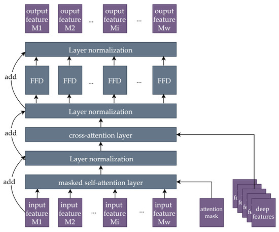 The decoder layers have the same structure as those in [30] and are slightly different from the encoder layers, as shown in Figure 7. The decoder layers replace the self-attention layer with a masked self-attention layer and have an extra cross-attention layer.