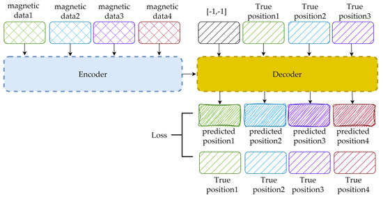 Figure 8 shows a simple example with B = 1 and W = 4. Considering the speed and stability of the training process, the data flow that occurs during network training is slightly different from that in the inference phase, which can be summarized as follows. First, the magnetic data are input altogether instead of in order, so the decoder runs only once instead of W times. Second, the input of the decoder is a one-step right-shifted version of the true position; [−1, −1] is padded to the first point in the sequence. Finally, during the online phase, we only focus on the position of the last point within the sequence. In contrast, every predicted position matters during training. The losses between the predicted and true positions of every point in the sequence are computed via gradient backpropagation.