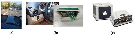 Dataset: Considering that the existing publicly available magnetic datasets [32,33,34,35,36] are not suitable for our application, we collected a dataset ourselves to evaluate the proposed method. Magnetic field data were collected from a Huawei Mate 20 Pro smartphone fixed on a vehicle, as shown in Figure 9a, and mileages were integrated by the velocities obtained from the On-Board Diagnostic (OBD) system of the vehicle. A self-developed module accessed the interface of the OBD system and transmitted the velocity to the smartphone, as shown in Figure 9b. The statistical results showed that the error of the integrated mileage was approximately 1% after calibration. Additionally, a differential GNSS/INS system called SPAN-ISA-100C (NovAtel Inc., Calgary, Canada) with a horizontal positioning accuracy better than 0.04 m/60 s [37] was used to evaluate the positioning accuracy of the magnetic localization results, as shown in Figure 9c.