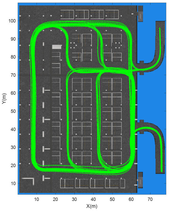 The test environment was a parking garage at the Beijing New Technology Base of the Chinese Academy of Sciences, which has an area of approximately 80 × 110 m2, as shown in Figure 10. We collected 35 tracks, with a total length of 8094 m, as shown by the green lines in Figure 10; each track was divided into numerous sequences with diverse sequence lengths. In this section, we set the sequence length L from 5 m to 15 m, with a spatial interval d of 0.5 m, so W ranged from 10 to 30, as calculated by Equation (1). Taking a W of 14 as an example, the total number of sequences was 15,733, and 27 tracks containing 12,130 samples were selected for training (accounting for approximately 77%), while the remaining 8 tracks containing 3603 samples were used for evaluation purposes.