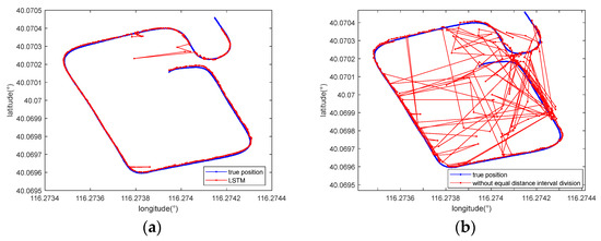 Comparison between the positioning results obtained with (a) LSTM and (b) the method removing the equal distance interval division module when using a 7-m-long sequence for track 1.