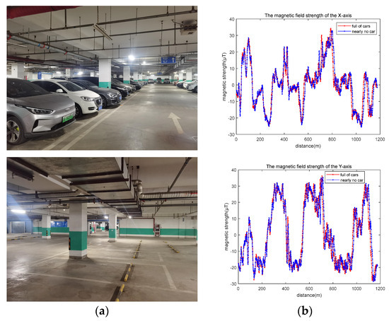 First, we estimated the impact of different surroundings. The validation data 1 were collected on a weekday morning, when the parking garage was full of cars, while the validation data 2 were collected on a weekend night, when almost no vehicles were in the parking garage, as shown in Figure 13a. The track is the same as the 7th evaluation data in Section 4.2.