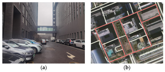 (a) A large ground parking garage in an urban canyon area with dense buildings; (b) driving routes.