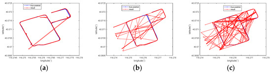 On the other hand, to indicate the effectiveness of the equal distance interval division strategy, it was removed before obtaining the positioning results. To conduct a fair comparison, the number of input points was set to 20 to ensure a sequence length of approximately 7 m when the average speed of the vehicle was 3.5 m/s and the magnetic data were sampled at 10 Hz. As shown in Figure 12b and the last column in Table 5, without the equal distance interval division module, the performance of the model drastically decreased.