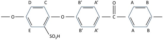 Degree of sulfonation (DS) in which , , , , , and refer to the area below the peaks on the H-NMR spectrum corresponding to the aromatic hydrogens on position A, B, A′, B′, C, D and E, respectively. The identification of the aromatic hydrogen peaks is given in Figure 2 [].
