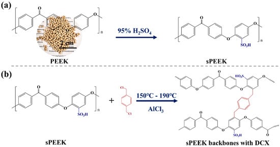 (a) The sulfonation reaction of PEEK into sPEEK, (b) the crosslinking reaction of the sPEEK with DCX via Friedel—Crafts.