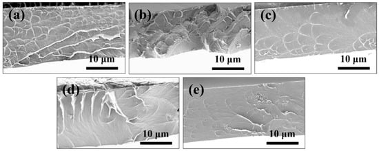 SEM images of the membrane cross-section of (a) sPEEK, (b) sPEEK/DCX, (c) sPEEK/DCX-s90°C, (d) sPEEK/DCX-CX24h, and (e) sPEEK/DCX-CX190°C.
