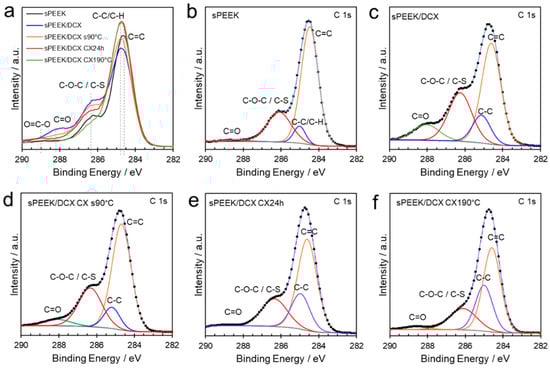 High-resolution C 1s XPS spectra of the synthetized membranes; (a) comparison of all membranes before deconvolution, (b) sPEEK, (c) sPEEK/DCX, (d) sPEEK/DCX-s90°C, (e) sPEEK/DCX-CX24, and (f) sPEEK/DCX-CX190°C.