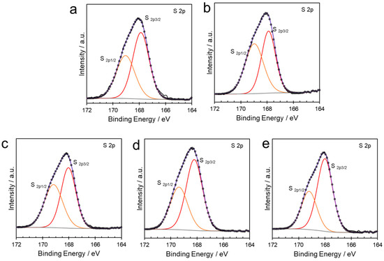 High-resolution S 2p XPS spectra of the synthetized membranes; (a) sPEEK, (b) sPEEK/DCX, (c) sPEEK/DCX-CXs90°C, (d) sPEEK/DCX-CX24h, and (e) sPEEK/DCX-CX190°C.
