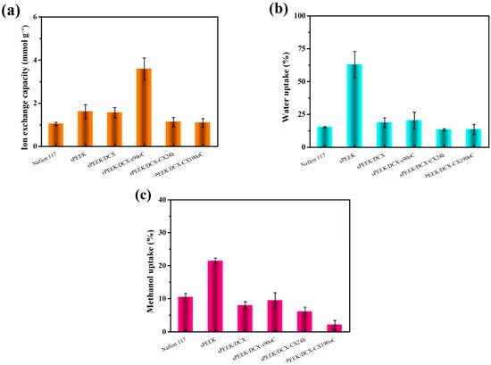 (a) Ion exchange capacity, (b) the water uptake, and (c) the methanol uptake.