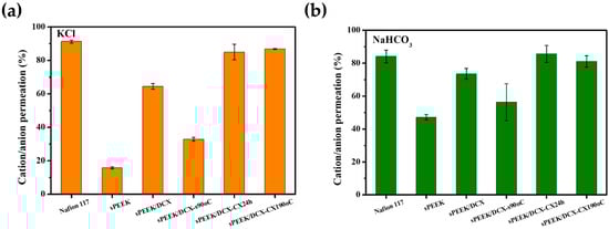 Cation/anion permeation of Nafion 117 compared to the synthesized membranes; (a) KCl cation/anion permeation, (b) NaHCO3 cation/anion permeation.