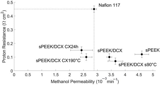 As mentioned before, very often, a trade-off has to be made between methanol rejection and proton conductivity when considering PEMs for applications in DMFCs and artificial photosynthesis. Figure 11 and Figure 12 show those two key performance parameters for Nafion 117 and the PEMs of this study. The methanol permeation data and the proton resistance values in Figure 11 are normalized by thickness and surface area. A thickness of 183 µm is assumed for Nafion 117, and the measured thickness of 20 µm is used for the PEMs of this study. Due to the normalization, Figure 11 shows the intrinsic properties of the membrane material without the influence of the membrane thickness. The most important observations are the lower resistance of the Nafion 117 membrane and the superior methanol diffusion coefficient of the PEMs of this study. These results are in line with the expectations. The morphology of Nafion consists of connected ionic clusters that serve as proton conducting channels [], leading to high conductivity, while sPEEK-based membranes are known to have limited conductivities []. The relatively high standard deviations for the proton resistance come from the high sensitivity of the measurement values due to the low membrane resistance (see Figure 12) and low membrane thickness.