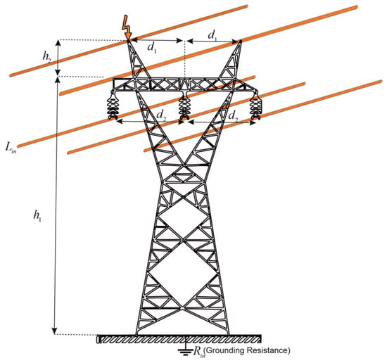 Direct drop of LEMPs on ETLs (h: the height of the transmission line, d1,2: the distance between insulators, h1,2: console height, Lin: conductor length).