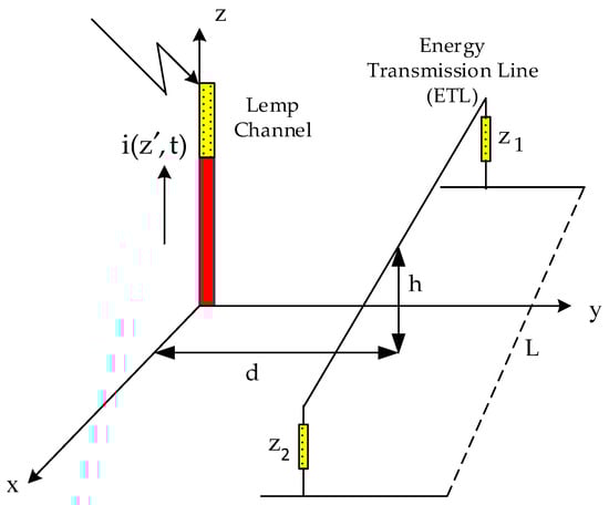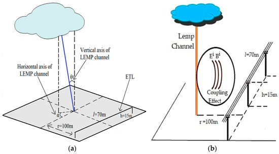 Electromagnetic fields are formed due to LEMP currents, and these fields can damage power grids [23]. Coupling between pulses and lines is achieved by utilizing different models of field line connections. Considering the geometry presented in Figure 4, these models are examined where the conductors are on perfectly conductive ground. Figure 5a,b illustrate how the coupling effect impacts the ETLs as a pair of electric and magnetic fields [23].