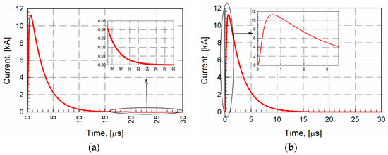 The LEMP form obtained by the Heidler current model is depicted in Figure 3a, with a detailed part denoted in Figure 3b. Figure 3a,b are derived mathematically [22]. Subsequent strokes can be modeled by varying the values of I0, τ1 and τ2 in the Heidler model. Two Heidler capacitors with specific parameters can be included to approximate the required current waveform. The advantage of the Heidler function is its ability to model a real lightning current more realistically because it closely approximates the characteristics of a real lightning strike.