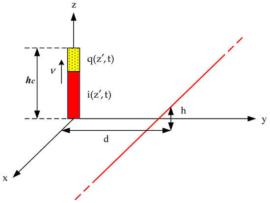 The mathematical model of the LEMP according to the Rusck model. (v: the velocity of the pulse along the LEMP channel; the length of the initially loaded channel is limited and is expected to be (). h: the height of the line from the ground).