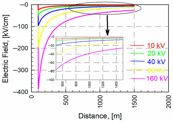 In Figure 11, the vector components of the electric field formed at the base of the overhead line located 100 m away from the point where the LEMP fell are shown for different current values. In Figure 12, the magnetic field values for the same configuration are denoted. If the equation “” is placed in Equation (26), the Vpeak value is obtained.