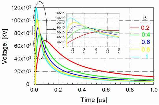 “” indicates the peak value of the induced stress recommended by IEEE standard 1410 [36,37]. Here, the β value indicates the relative velocity. Similarly, the actuation voltage was obtained from a line 15 m tall and 70 m away from the point where the LEMP fell Figure 13. The distance between two transmission poles, d = 70 m, is defined. The values were chosen because Turkish transmission systems typically use a distance between 40 and 70 m. This falls within the range of 15–40 m commonly used in Turkish transmission systems. The height of the pole, h = 15 m, is also defined. The lowest value was chosen to better understand the effect of the indirect pulse on the transmission line. The voltages concerning different β values (relative speed) were obtained for an LEMP current of 15 kA.