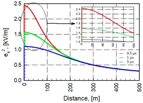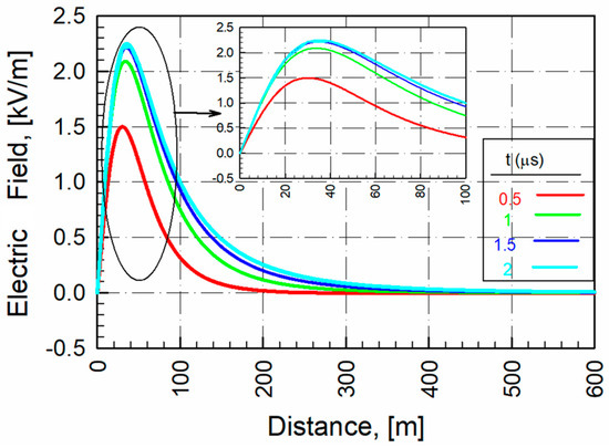 In Figure 10, the distance to the point where the LEMP falls according to different current values is determined as 100 m from the transmission line. The reason for choosing this value is to ensure that the pulse is close to the power transmission lines. The vertical electric field value formed at the foundation of the overhead line at this distance is shown in Figure 11. This value drops to zero when the return pulse approaches the cloud. The eA component due to the LEMP current starts to increase from zero. Initial values are obtained if the t = r/c equation is written instead of t in the equations in Equations (21) and (22). In Figure 11 and Figure 12, , eA and are analyzed and represented analytically.