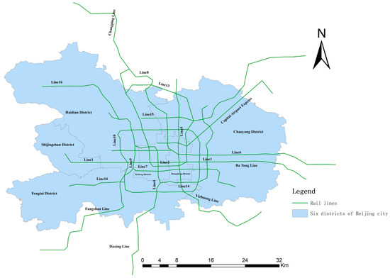 The Beijing rail transit Lines 1, 2, 4, 5, 6, 7, 8, 9, 10, 13, 14, 15, 16, Fangshan Line, Changping Line, Daxing Line, Batong Line, Yizhuang Line, Capital Airport Line, which have been put into operation in 2019 and are the objects of this study, result in a total of 19 lines and 288 stations. The Beijing rail transit line map is shown in Figure 1.
