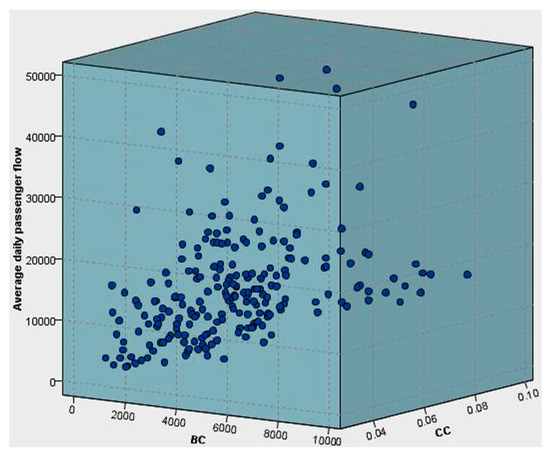 After the new rail transit line is connected or the new station is built, the original network topology characteristics will be changed. Therefore, the topological characteristics have a long-term impact on the entire network structure, and as the structure continues to change, the convenience of passenger travel will also change. Figure 3 also shows that the closer to the city center, the greater the value. It shows that the rail transit stations in the center of Beijing bear a large amount of passenger flow, which is of great significance to the whole subway network. At the same time, it can be concluded in Figure 3 that the betweenness centrality and clustering centrality of the site are positively correlated with passenger flow.
