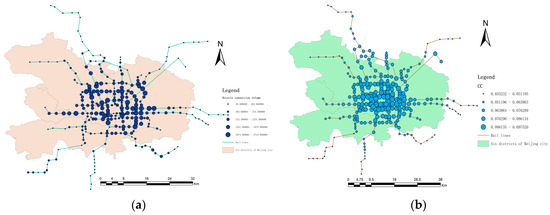 Connectivity properties. (1) Betweenness centrality (BC) [20,21] is usually measured in terms of the number of points and edges, and BC solves the global problem of planning the optimal distances between stations to make the entire metro network balanced. The centrality of the median reflects the connectivity performance of the station, as well as the importance of the station, which, in turn, affects the ease of transferring passengers at that station. The easier it is for passengers to transfer, the more they save on travel costs, which indirectly attracts a large number of passengers to the station. As shown in Figure 2a, the number of points on Line 6 and Line 4 located within the third ring road of the city center and Line 14 in the eastern Chaoyang District are larger, indicating that the connectivity of these stations is stronger.