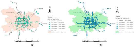 Population characteristics. (1) Working population: As shown in Figure 6a, the he closer to the center of Beijing, the higher the working population, and travelers take the subway to work in the daytime and take the subway to return to their residence in the evening, so it is the main source of rail transit passenger flow.