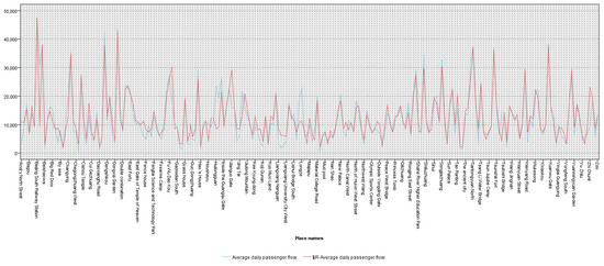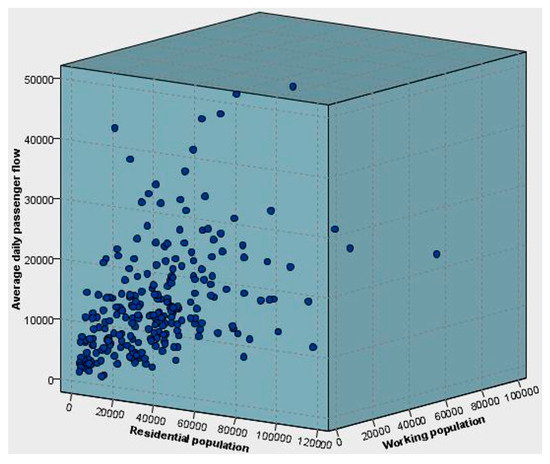 The flow of people near the rail transit station is the direct source of the station’s passenger flow, which is the most important link affecting the station’s passenger flow. As shown in Figure 7, the working population and the residential population show a positive correlation for the subway’s passenger flow. The long-term mobility of the population directly affects the planning and design of rail transit stations in the coming decades.