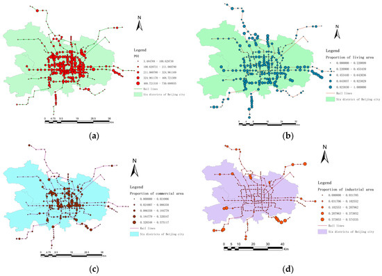 (3) Commercial area ratio: Commercial facilities are also mainly concentrated in the city center. The larger the area of the commercial area around the rail transit station, the greater the attraction of passenger traffic, thus attracting a large number of passengers to the station. As shown in Figure 8c, the number of commercial areas near the stations located in the southwest of the city center on Line 2, Line 4, the southeast of Line 2, Line 10, the northwest of Line 10, and the outer ring of Yizhuang Line is larger, and thus the passenger flow near the stations will be relatively larger.