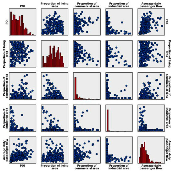 As can be seen in Figure 9, the POI density value around the station has a greater impact on the metro passenger flow, showing a strong positive correlation. The correlation between commercial area ratio, residential area ratio, and passenger flow is weak. The ratio of industrial area does not show a linear correlation with metro passenger flow. Usually, building facilities will remain for a long time without special circumstances, but commercial buildings may close down at any time, which generates irregularity in population flow. The industrial buildings are located in the outer ring suburbs and other areas, the population is small, and the correlation with the passenger flow of rail transit is not strong. The pre-planning of rail transit lines and stations is mainly based on whether or not the nearby buildings and facilities will bring a large number of passengers to the station. Therefore, building facilities have a long-term effect on the passenger flow of rail transit.