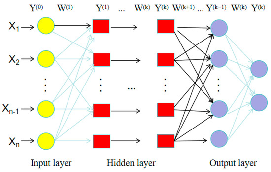 Each neuron in the input layer represents an influencing factor, and the data corresponding to these factors are built into the matrix , which is input into the neural network-like model, assuming that the number of layers of the neural network is K (k > 1) and the number of nodes in each layer from the input layer to the output layer is , respectively. The dimension of the input vector is , the output vector is , and the output vectors for each layer of the network are, respectively, denoted as follows: