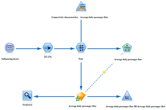 The SPSS Modeler 18.0 (Statistical Product and Service Solutions Modeler) is a data mining work platform, and this paper relies on this platform for model construction. The modeling idea is to import the source file data first, randomly select 80% of the data as training samples, and then establish the field types of the influencing factors. Use ten-factor variables as input fields, the average daily passenger flow as the target field, and then select the class of neural network models used, and then, finally, the target passenger flow prediction results are visualized with multi-curve graphs and predictive analysis as the visualization output. At the same time, in order to visualize and analyze the relationship between the influencing factors and the passenger flow, the Graph tab selects the graphical version of the node, and the visualization type selects the 3D scatterplot and scatterplot matrix (SPLOM). From the idea of building the model as in Figure 11, in the construction tab of the neural network-like model node, the boosting algorithm in the objective is selected to enhance the accuracy of the model, thus creating a whole, from which a sequence of models is generated to obtain more accurate predictions. Afterwards, after continuous comparison and adjustment, the network model is selected for the multilayer perceptron, and the number of hidden layers is automatically calculated by the SPSS Modeler for the number of cells. The stopping rule applied for the multilayer perceptron was chosen to use a maximum training time of 15 min. In the overall tab, the default merge rule used for continuous targets is the mean and the number of component models used for boosting is 25. Finally, in the advanced tab, missing values in the predictor variables are selected to be deleted in columns and, finally, random seeds are generated.