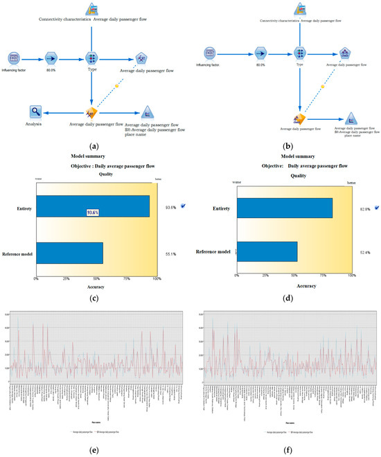 Previously, some researchers used the CART regression tree to analyze the influence factors of subway passenger flow, but the results were not very good. Meanwhile, in order to maintain the uniformity of the model results, this paper chooses the CART tree model and the Chaid tree model in SPSS Modeler software 18.0 to predict the same data set. The idea of model construction is similar to the class neural network, as shown in Figure 14a,b.