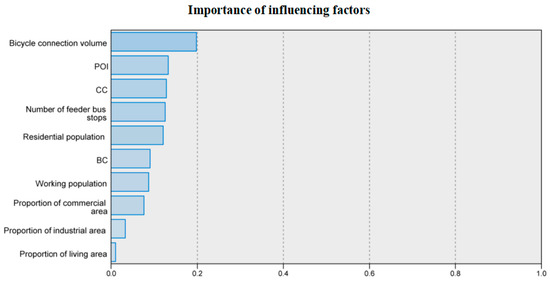 After prediction by the SPSS Modeler, the order of importance of the predictor variables is derived from the analysis module. In Figure 15, it can be concluded that the amount of bicycle connections has the strongest degree of importance for rail transportation passenger flow. Bicycle sharing is the most important transfer tool to solve the primary or last-mile problem of urban residents, and it is the main way to solve the problem of road traffic congestion in large cities, reduce travel time, and improve travel efficiency. POI density, which ranks second in importance, is one of the main factors considered by the metro company when planning station locations and routes in the early stages, and the metro lines passing through or stations arranged in the vicinity of buildings and facilities with a strong attraction to the population bring a large number of passengers to the newly built stations. The last two factors, industrial area and residential area, have the least impact on passenger flow. The closer the city center is to the city, the higher the population is, and due to the special characteristics of the industrial buildings and facilities, they are located outside the city center, and the smaller population has less impact on the metro passenger flow. Residential areas are usually a certain distance away from subway stations, and residents often choose to share bicycles, walk to nearby subway stations, or go to bus stops closer to their residential areas and take buses to travel, so the proportion of residential areas has the least impact on subway passenger flow.