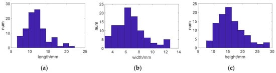 Distribution of the pebble dimensions (a) length; (b) width; (c) height.