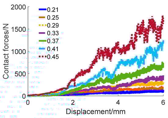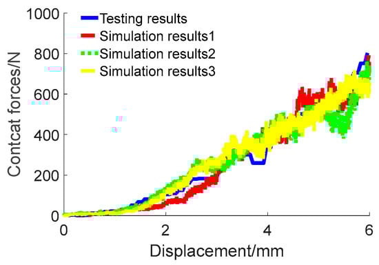 An analysis of Figure 10 indicates that the curve can be distinctly categorised into two phases: the ‘smooth period’ and the ‘stressed period’. The smooth period ranges from 0 mm to 1.00 mm, during which the contact force gradually escalates from 0 N to 14.87 N, exhibiting a relatively slow rate of increase. By contrast, the stressed period spans from 1.00 mm to 6.00 mm, where the contact forces markedly surge to approximately 625 N. The curve exhibits several fluctuations throughout this phase.