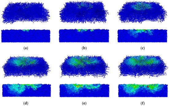 Upon the downward application of the pressing plate, the particles initiate a descending motion, with the impacted range expanding as the plate continues to press down, as can be seen from the above-mentioned figure. A cross-sectional analysis at the centre reveals that initially only a few particles in direct contact with the pressing plate are stimulated. At a depth of 0–2 mm, particles begin to compress against each other, intensifying with further penetration. In the range of 3 mm to 5 mm, acceleration is observed on the sides, whilst the centre exhibits a slower velocity. This phenomenon indicates that initially only the surface particles are affected by the pressing force. However, the force transmission amongst particles propagates as the plate penetrates deeper, causing those directly beneath the plate to descend synchronously and those around the periphery to accelerate. The central particles experience compression from the sides, resulting in less noticeable positional changes.